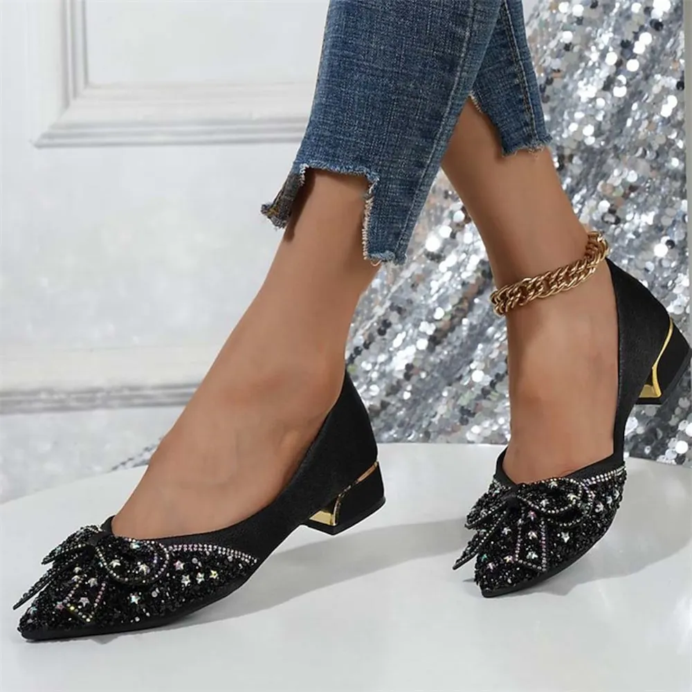 Women’s Glitter Flats with Bow Detail – Elegant Rhinestone Embellished Low-Heel Shoes for Party and Formal Occasions