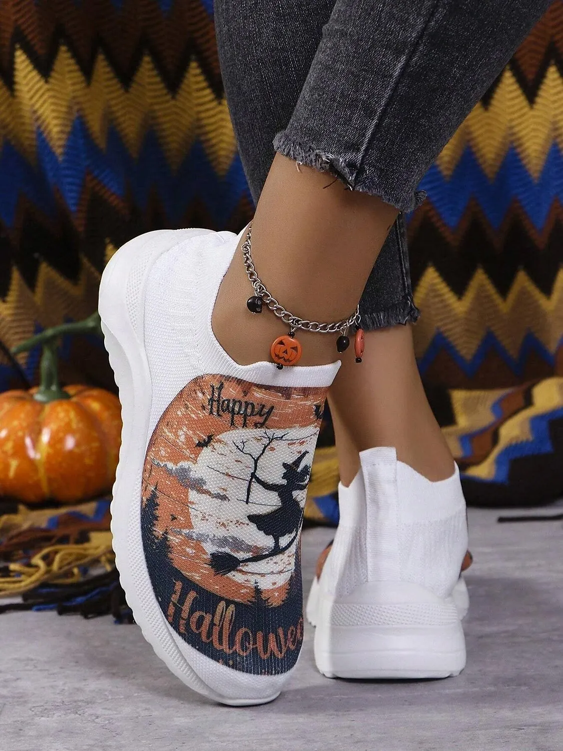 Women’s Halloween Witch Print Slip-On Sneakers – Festive and Comfortable Knit Shoes for Casual Wear and Halloween Celebrations