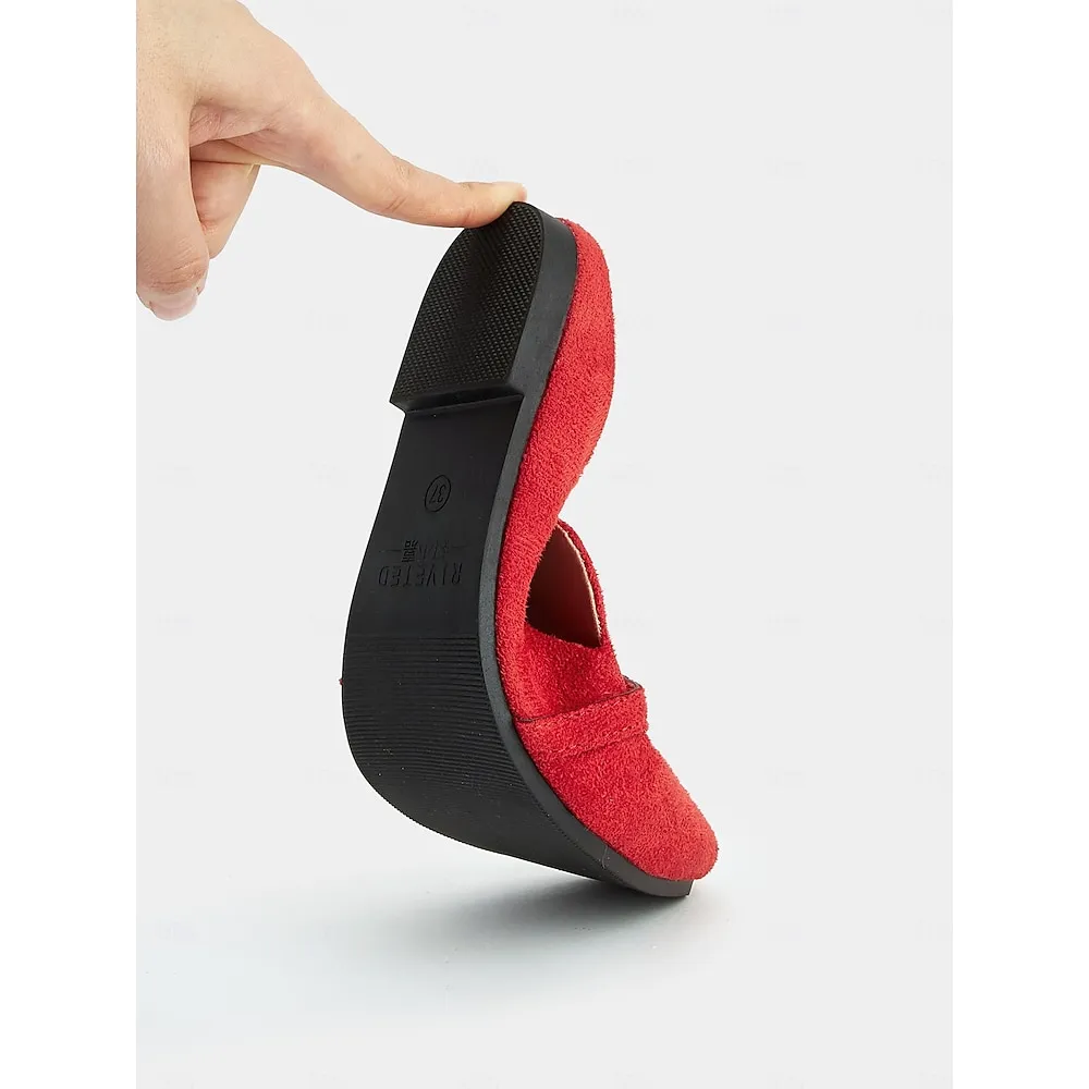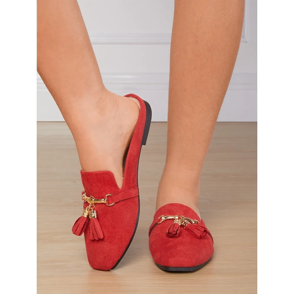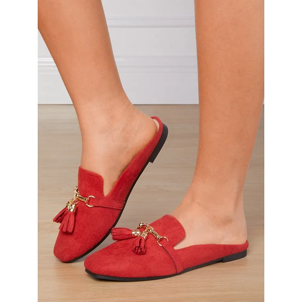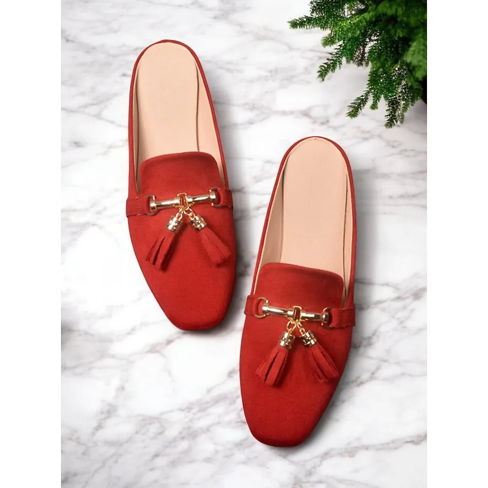 Women’s Red Faux Suede Elegant Tassel Mules with Gold Chain Detail for Casual & Office Wear