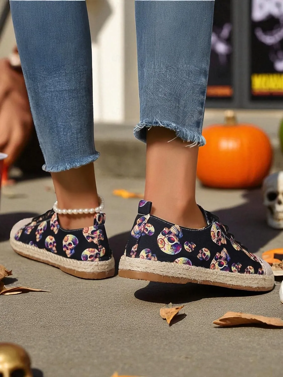 Women’s Skull Pattern Canvas Espadrilles with Jute Sole – Lace-Up Halloween Sneakers for Gothic Style, Fall Outfits and Daily Comfort