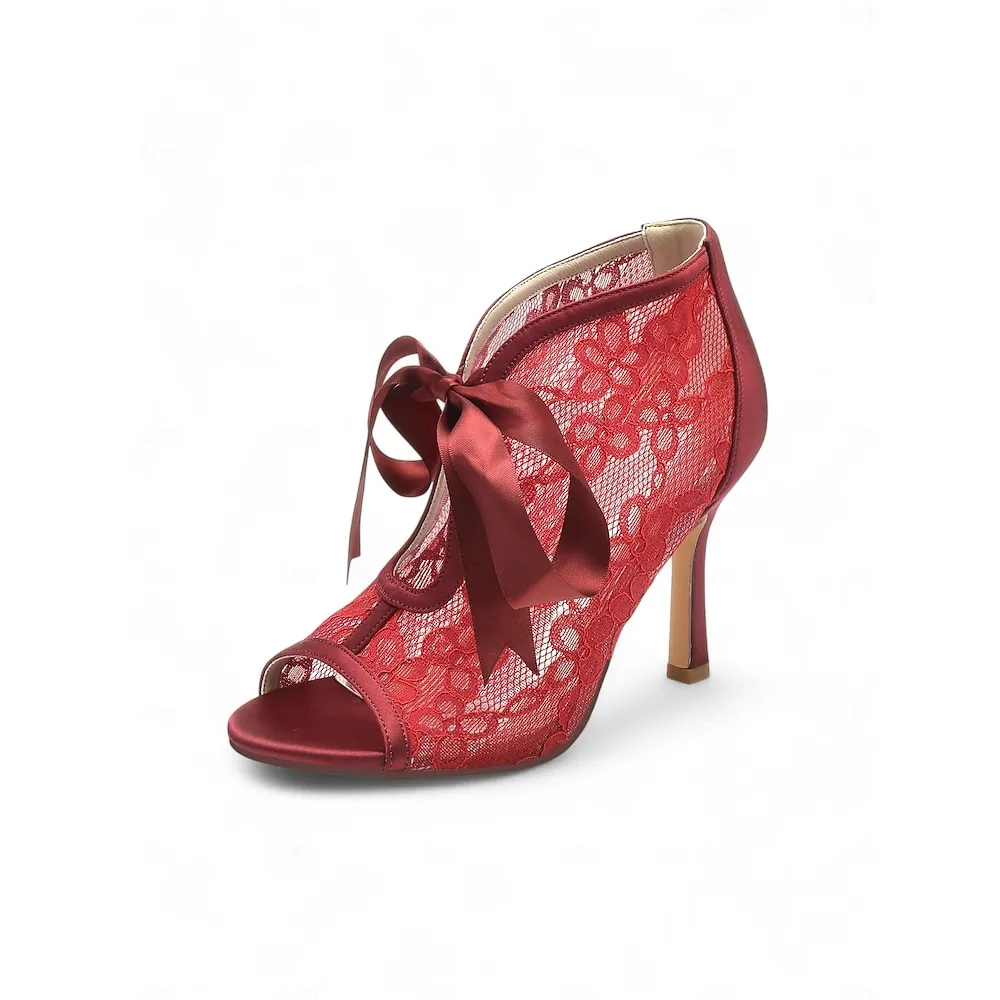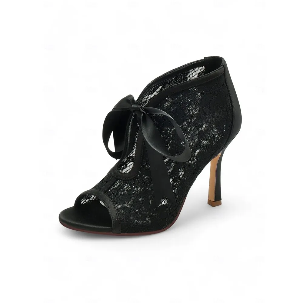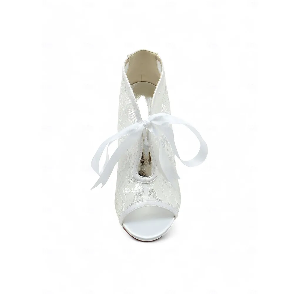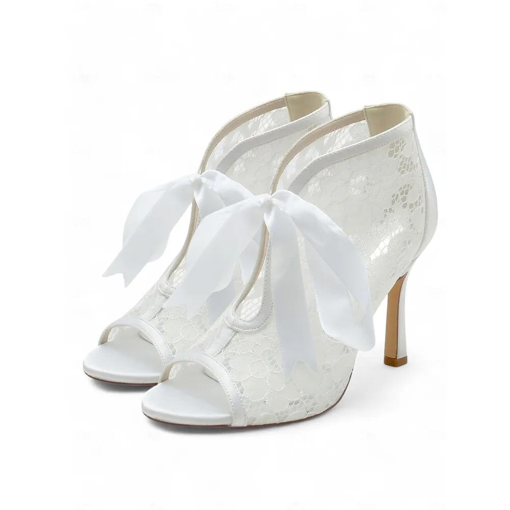 Women’s White Lace Peep-Toe Ankle Booties with Satin Ribbon Tie – Elegant High Heel Wedding Shoes for Brides